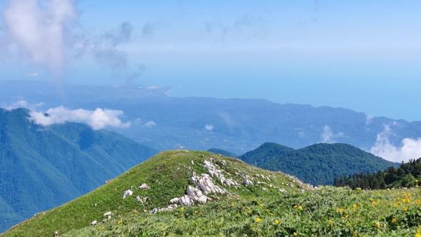 Мамзышха – уникальная обзорная точка. Высота 1873 м. В круговой панораме слева направо виден массив Арбаики, пик Спелеологов, Агепста, ГКХ в районе Кардывача, Анчхо, Бзыбское карстовое плато. Берег моря просматривается от Нижней Эшеры до Адлера.