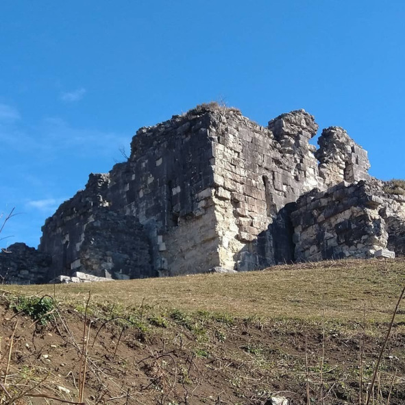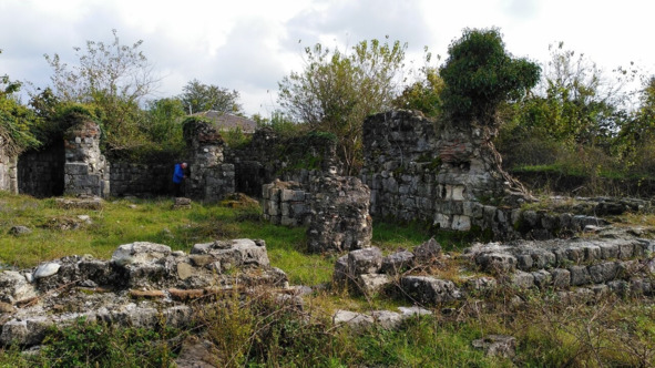 В самом начале Рицинского шоссе слева по ходу над дорогой, в окружении крепостных стен, возвышаются руины храма. Он относится к IХ веку. К храму ведёт металлическая лестница. Крепость VIII века занимает две площадки, разделённые стеной. Раньше река вплотную подходила к скале, строители удачно выбрали место. Храм – это трёхапсидная крестовокупольная церковь с высокими продолговатыми окнами и хорошо сохранившимися стенами. Первые археологические раскопки здесь провела в 1886 г. экспедиция графини Прасковьи Уваровой, затем в 1955 г. были очищены от наносов внутренности храма, открывшие остатки керамики и облицовочные плиты. Отсюда можно оценить значение крепости, как ключа к Бзыбскому ущелью. Как на ладони видно всё селение Бзыбта, лента реки, ипподром, соседнее село Калдахвара и Калдахварское нагорье.