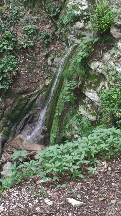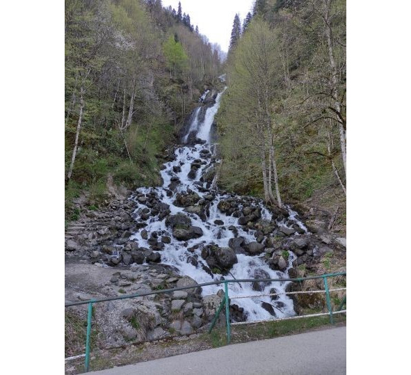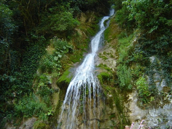Пока по основной трассе несутся к озеру Рица переполненные туристами автобусы и кавалькада разных машин, а на красивых локациях вдоль маршрута кипит людская масса, совсем рядом с дорогой, в тиши колхидского леса прячутся настоящие жемчужины абхазской природы. Одной из них является красивый утаённый от людского глаза водопад. Путь к нему начинается от апацхи «Охотничий домик» слева по дороге на 10-м километре. Идти по извилистой, местами крутой тропе недолго, около 15 минут. Это примерно 1 км. В пляжной обуви не пройти, нужны по меньшей мере кроссовки. И палки, местами довольно скользко. Под водопадом можно освежиться после жаркого перехода. И просто подышать озоном вокруг падающей воды.