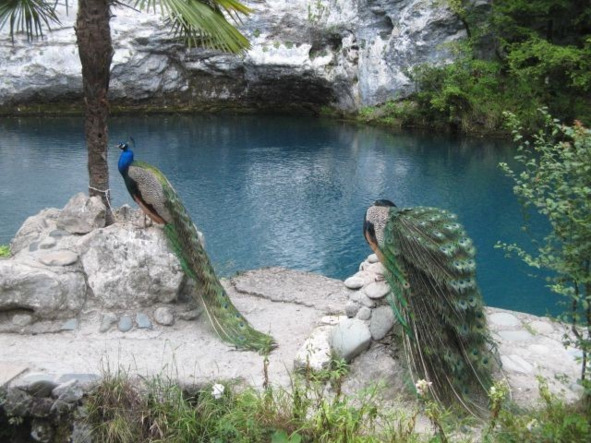Нужно иметь в виду, что от КПП выше все локации можно посетить, только купив билет за въезд на территорию Рицинского национального парка (в 2022 году это было 700 рублей с человека). В 400 м от КПП, слева от шоссе расположено одно из чудес Рицинской дороги. Это карстовое озеро Азыква (от «Азыхъква», «много родников»), известное среди туристов как Голубое. Изумительный густо-голубой цвет воды не меняется, независимо от погоды и сезона. Питается глубинными родниками. Глубина озера до 25 м, площадь около 100 м2. Находится на высоте 107 м у подножья горы Цхуна. Из озера с шумом вытекает речка Дзышха, чья жизнь ограничена несколькими десятками метров, она тут же впадает в Бзыбь. У воды стоят чучела медведя, павлина, с которыми фотографируются дорвавшиеся до чудес туристы. Голубое озеро – один из воклюзов Гагрского хребта. Поэтому в любой, даже самый засушливый период, оно не иссякает. У озера организован шумный рынок. Вам будут пытаться впихнуть фальсифицированные мёд и вино. Не стоит ничего покупать в непроверенном месте. Да и по всей трассе устроены места дегустации. Недобросовестные экскурсоводы и водители заинтересованы в том, чтобы Вы купили в этих местах непроверенную продукцию, не поддавайтесь на уговоры.