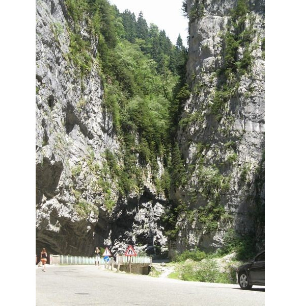 На 29-м км рицинской дороги Вы попадёте в интересную локацию, особо популярную среди туристов. Слева по ходу отвесными стенами обрывается Гагрский хребет, справа – скалы Бзыбского. Между ними расстояние столь мало, что кажется, будто прямо по ходу непреодолимая стена. Образованию уникального каньона послужил первоначальный раскол активно поднимающегося массива осадочных пород, имевший место несколько миллионов лет назад. В дальнейшем выпирающие пласты слоистых известняков и мегрелей пилила неутомимая река. Здесь особенно можно оценить трудности в прокладывании через Юпшарский каньон дороги. Она строилась в 1932—1936 гг. И здесь, конечно же, раскинулся рынок. Если не обращать внимания на людское море, виды в каньоне фантастические.