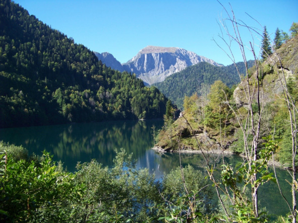 Малая Рица покоряет своей иззелена глубокой синевой, своим покоем. Она большая, взгляду есть где отдохнуть. Её стерегут склоны с дремучим пихтарником, который лишь в одном месте сменяется полосой криволесья – это трасса рушащихся с Пшагишхи лавин. Из воды косо торчат упавшие стволы. Они видны и сквозь прозрачную воду, но в ней выглядят более пологими, словно они надломлены о поверхность озера.