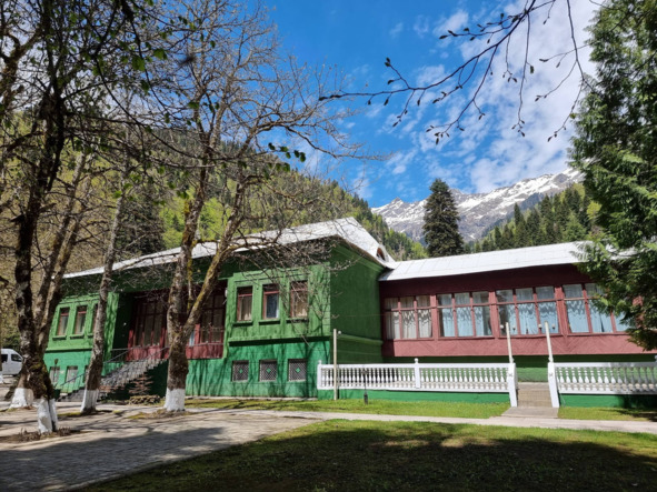 Дача расположена в 4 км от обзорных площадок на западном берегу озера и в 1,5 км от Молочного водопада. Экскурсия платная, в 2022 году это стоило 200 рублей. Построена была в 1947 году по рекомендации Н.С.Хрущёва, который посетил эти места в составе туристской группы. С 1937 года здесь стоял охотничий домик – небольшая гостиница для партийной элиты. Архитектором дачи был Мирон Мержанов. В строительстве дачи принимали участие немецкие военнопленные. Кстати. И дорогу от начала Рицы до Ауадхары строили они. Трёхэтажное здание дачи имеет довольно скромный вид. Чего не скажешь о качестве интерьера. Как и все сталинские дачи, она окрашена в зелёный цвет. Это делалось в целях маскировки. Вопросам безопасности вождь уделял особое внимание.