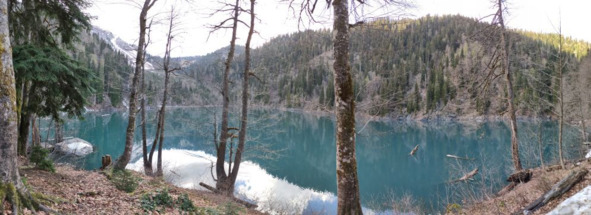 Особо примечательна одна подробность, которая важна для разгадки: когда же образовалось озеро. Евгений Холодовский в 1930 г. Пишет: «Вдоль берегов местами из воды торчат стволы пихт – остатки леса, оказавшегося теперь на дне озера», на приведенной фотографии видим ряд ободранных стволов без верхушек. Означает ли это, как полагает Е. Е. Холодовский, что это остатки затопленного при образовании озера леса? Эти стволы обнаружил и географ Ю. К. Ефремов в 1936 г. И он утверждал, что озеро образовалось в результате сильного землетрясения в конце 1891 г. И образование большого озера прошло незаметно в безлюдном районе. Ведь здесь никто не жил. Следы построек встречаются лишь в Ауадхаре и внизу, в районе посёлка Бзыбь.