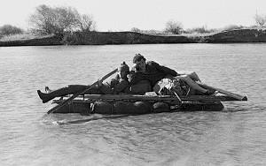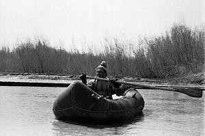Из техники выбор пал на надувную резиновую лодку, в которую с трудом помещались три человека. Рюкзаки туда явно не входили. С этой проблемой мы справились довольно быстро. Для рюкзаков был спроектирован плот, состоящий из больших брезентовых мешков, набитых накачанными камерами от мячей. На настиле из досок, соединяющем как палуба мешки, должны были спокойно лежать наши рюкзаки. Весь плот, согласно генерального плана, должен был двигаться сзади лодки на привязи, не мешая общению с природой.