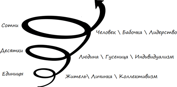 Думаю, читателю понятно, что стадия коллективизма соотносится со стадиями Жителя или Личинки, стадия индивидуализма – со стадиями Людины или Гусеницы, а стадия лидерства – со стадиями Человека или Бабочки.