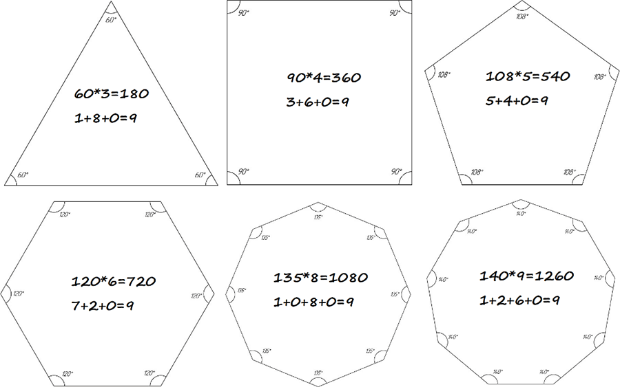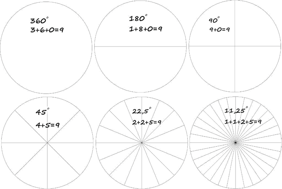 • Не менее удивительно выглядят сумма чисел углов круга, разбитого на две, четыре, восемь и шестнадцать частей, которые сводятся к числу 9. Если продолжить делить круг подобным образом, данная последовательность сохранится до бесконечности.