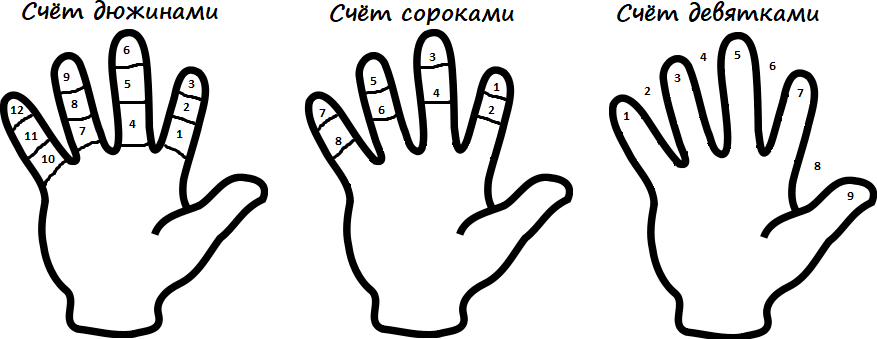 Счет дюжинами вёлся большим пальцем по фалангам остальных четырёх пальцев правой руки и начинался от нижней фаланги указательного пальца, а заканчивался верхней фалангой мизинца.