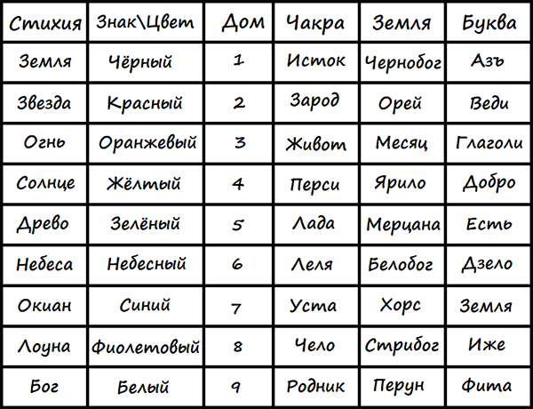Перечислим для наглядности все девять цветов, девять чакр, девять домов, девять знаков и девять основных управителей в виде сводной таблицы. В данной таблице цифрами обозначены все девять Стихий, а сами строчки, закреплённые за этими цифрами, и есть основные элементы данных Стихий.