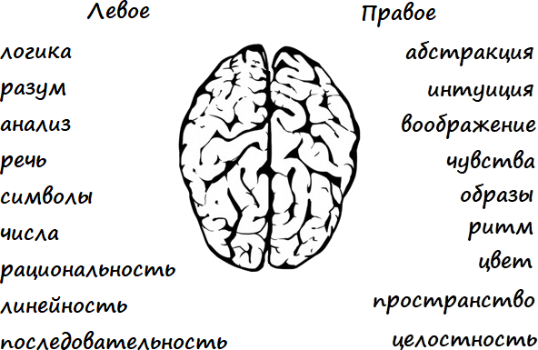 На представленном рисунке изображены два полушария головного мозга и обозначены те функции полушарий, которые, по мнению учёных, они выполняют.