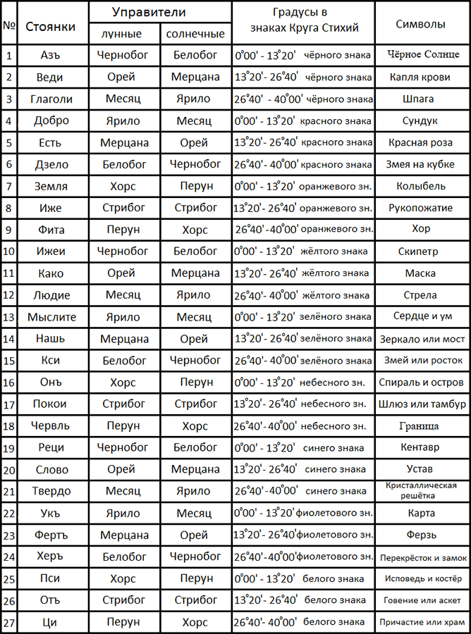В нижеприведённой таблице мы обозначим оба круга управителей, а также названия стоянок, которые соответствуют названиям двадцати семи букв, имеющих числовое значение. Помимо прочего в таблице будут указаны градусы расположения стоянок в знаках Стихий и символы стоянок.