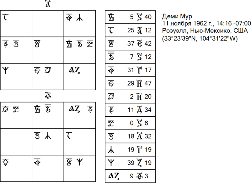 Пример, Месяц в стоянке ВедиМесяц в любой из карт символизирует мать и родителей человека. Известно, что Деми Мур родилась в неблагополучной семье, ещё до её рождения родной отец бросил семью, а затем попал в тюрьму. Её мать вступила в брак во второй раз, и опять неудачно – отчим был пьяницей и заядлым игроком. Мать Деми часто попадала в полицейский участок за пьянство за рулём и домашние дебоши.