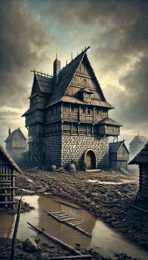 Закрепив плот, мы отправились по петляющей тропинке вглубь деревни. Тут и там сновали куры, которых я узнал по описанию матери. Они с кудахтаньем разбегались из-под наших ног, жалуясь всему миру на пришельцев. Пройдя мимо нескольких домов, мы вышли к большому двухэтажному дому, стоящему на некотором отдалении от прочих. Земля вокруг была вытоптана. Простой деревянный забор, скорее для вида, чем для защиты, отделял высокий дом от остальной деревни. Нижняя часть строения была сложена из камней. Валуны так плотно подогнали друг к другу, что я поразился – ничего похожего на другие хижины. Второй этаж и пристройки были деревянными, но выглядели очень добротно. На крыше виднелись дымящиеся трубы. Из самой большой валил густой дым с запахом смолы и чего-то кислого. У забора валялись обломки костей, то ли от ужина, а может, оставленные по другой причине. Бревна второго этажа были вытесаны с таким умением, какого я не видел в хижинах у воды. Каждое выглядело как брат-близнец следующего.