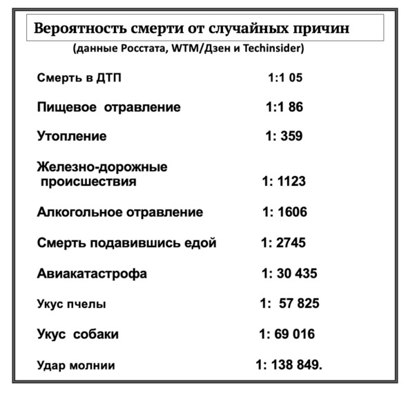 Но, как видно из таблицы, шансы человека погибнуть от случайных причин в десятки или даже в сотни раз меньше, чем смерть от широко известных и распространённых заболеваний, на которые мы с помощью современной медицины можем повлиять.