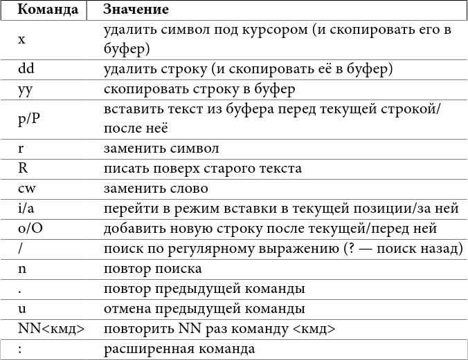 Его интерфейс на первый взгляд совсем не дружественен и не логичен, на деле же большинство его команд продуманы и удобны. Главное его преимущество – возможность работы практически в любых условиях и быстрое выполнение массовых операций (поиск, замена и т. п.). Он имеет два режима работы – командный и режим вставки. Изначально файл открывается в командном режиме. Для перемещения по тексту используйте клавиши курсора, если же они не работают, – клавиши 'h,j,k,l' (посмотрите на клавиатуру и поймёте, почему такой странный набор). Клавиши w и b перемещают вперёд и назад на слово. И конечно, «главная» команда – выход с сохранением: ':wq' или просто 'ZZ' (заглавными буквами). Выйти без сохранения можно командой ':q!'.