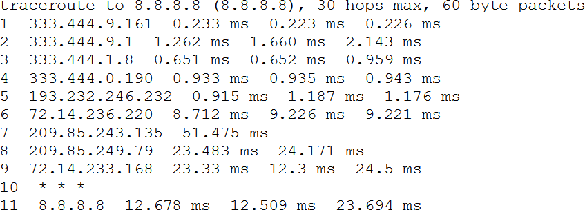 Видно, что 10-й по счёту узел не ответил; это значит, что он просто игнорирует пакет, не уведомляя об этом отсылающего.