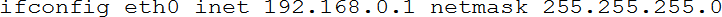 Эта команда задаст для интерфейса eth0 адрес 192.168.0.1 и маску 255.255.255.0. После этого надо включить (поднять) интерфейс командой ifconfig eth0 up. В большинстве реализаций команда ifconfig автоматически создаёт правило маршрутизации.
