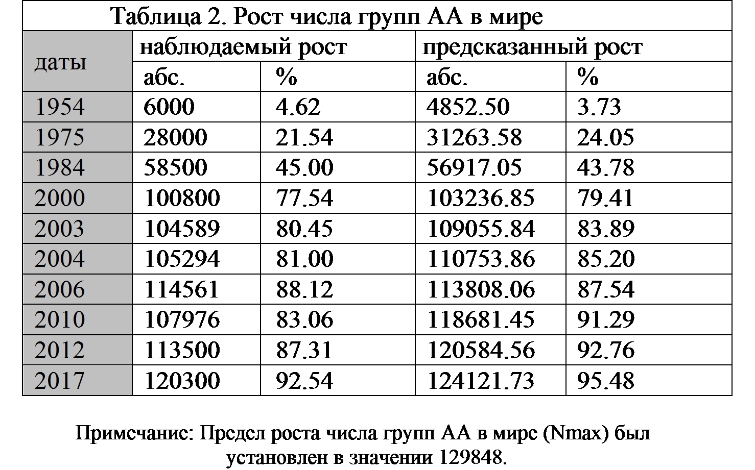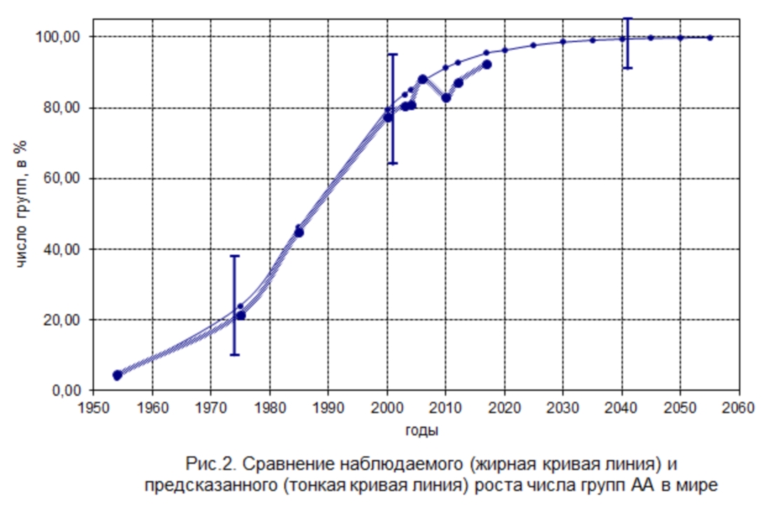 Точками на кривой обозначены годы, предшествующие датам публикации отчётов Центрального бюро (Папка АА, 2004-2018), а также датам переизданий основной книги мирового сообщества АА «Анонимные алкоголики» (“Big Book” или «Большая книга»; см.: БК, 1939-2011), которая также содержит данные о количестве групп АА (см.выше). Точки соединены на рисунке жирной линией, доведённой до 2017 года, т.е. годом ранее даты опубликования последнего замера. Это и есть кривая «наблюдаемого роста» числа групп АА. На ней хорошо различимы три участка с различной крутизной. Отрезок от середины 1950-х гг. до сер.1970-х гг. демонстрирует сравнительно медленный прирост. На сменившем его втором участке от сер.1970-х гг. до начала нулевых годов XXI века, наблюдается ускоренный рост, а в конце этого периода можно видеть непонятный кратковременный всплеск, хотя в целом заметна тенденция к плавному снижению роста в третьем периоде, начавшемся ок.2001 г. На графике эти участки разделены вертикальными отрезками. Рядом с этой кривой проведена ещё одна, примыкающая к ней вплотную. На графике она обозначена как «кривая предсказанного роста». Это её узаконенное название в научной литературе, и ниже мы рассмотрим её более подробно.