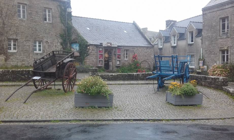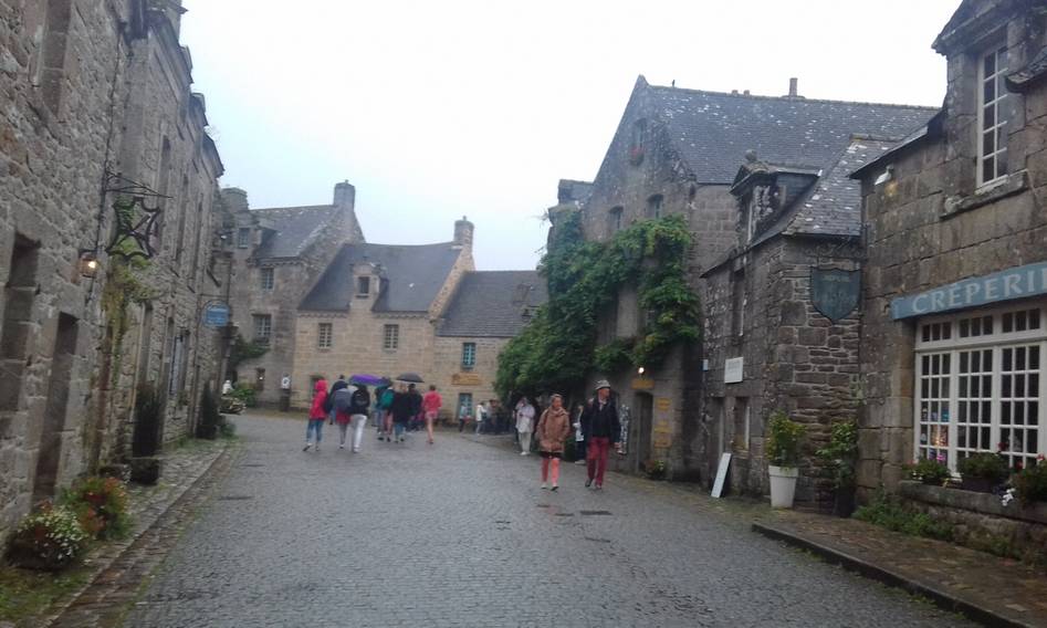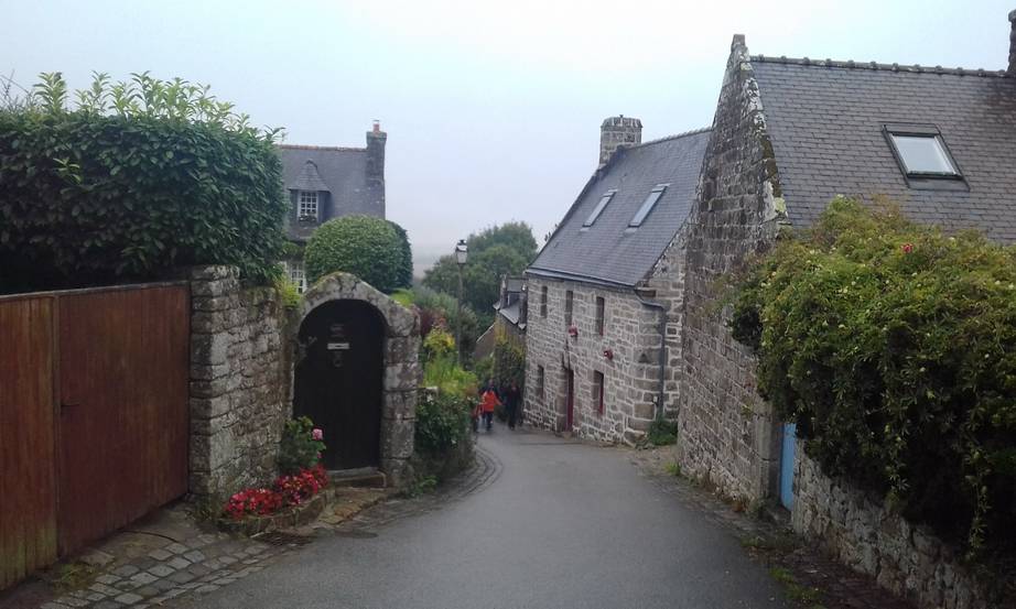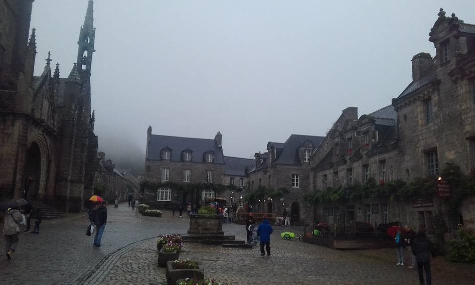 40 километров мы преодолели за 45 минут и это хорошая новость. Однако была и плохая – дождь усилился и к моменту прибытия в Локронан лил как из ведра. Селин, которая вела машину, хотела довезти меня до какого-нибудь кафе, чтобы я смог переждать ливень, но машину остановил человек в дождевике. Совсем молодой парень честно нес службу на въезде, несмотря на непогоду. Он объяснил, что в Локронане местные власти полностью запретили въезд машин в деревню. Так что пришлось мне рыться в рюкзаке в поисках зонта.