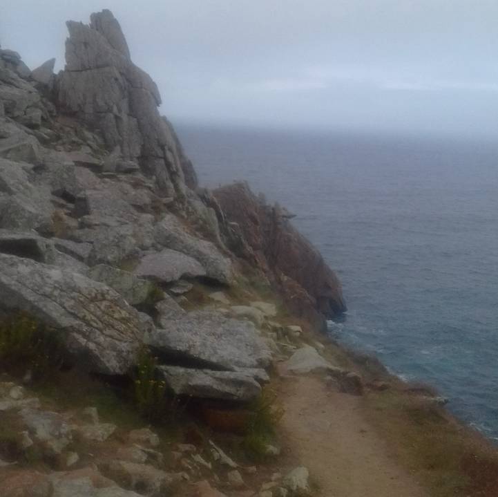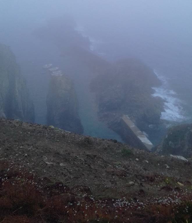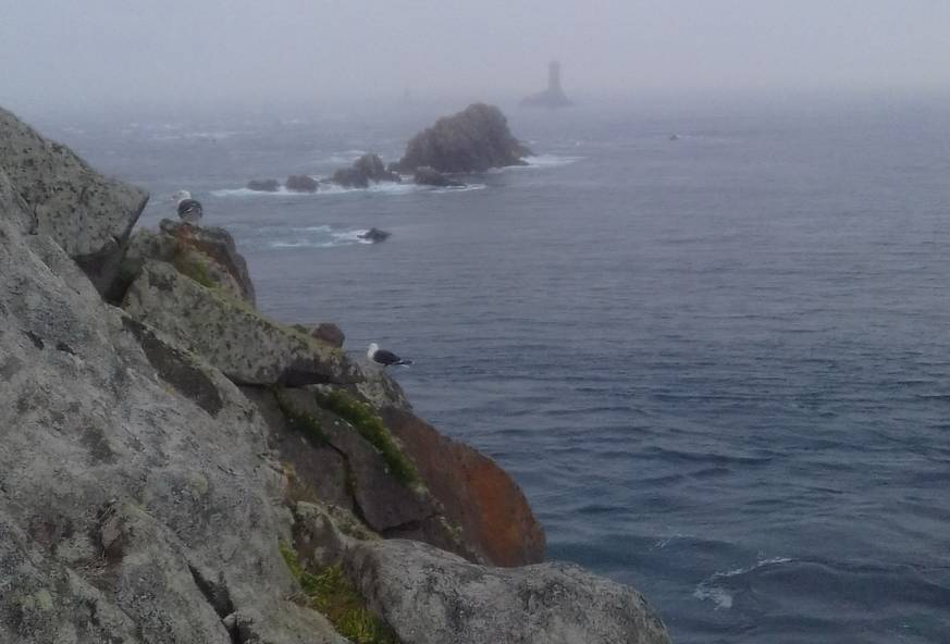 Пока я карабкался по камням, лодка тоже продвинулась к оконечности мыса, но по воде. Всё это время я думал, что это спасатели, хотя и не остановили меня, но следят за моими действиями, готовые прийти на помощь, если я свалюсь в море. Но, добравшись до финиша, я понял, что у меня случился приступ мании величия. Туман почти рассеялся, и я понял, что это рыбаки, проверявшие свои сети и скорее всего даже не заметившие меня. Позже я узнал, что они не случайно работают в такую бурную погоду – ее очень любит атлантическая рыба бар и именно сейчас у них больше шансов на большую добычу.