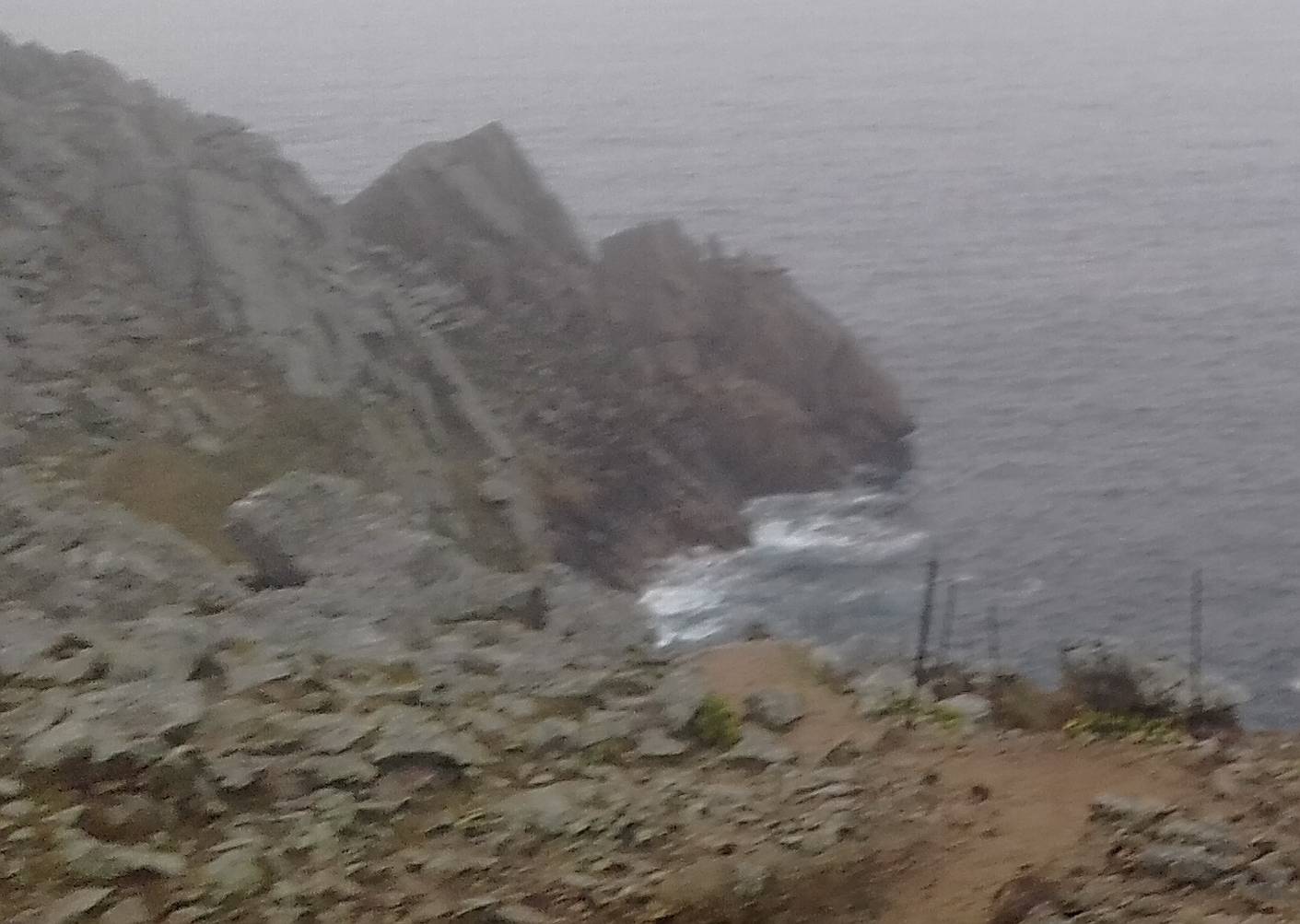 Пора было возвращаться. Но сначала я переместился немного левее и выглянул из-за скалы – гребня мыса – на другую, южную сторону. Отсюда было хорошо видно тропу, по которой я пришел к маяку. Море с этой стороны бурлило меньше, клочья тумана плыли над водой.