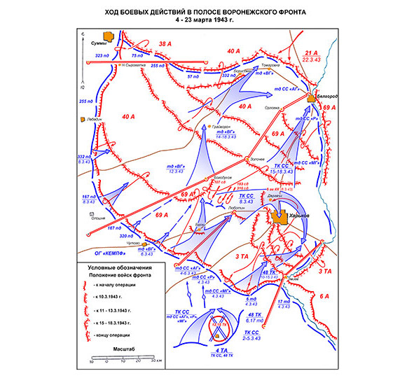 Ставка ВГК 1 марта утвердила решение о переходе к обороне, принятое руководством Воронежского фронта из-за кризисной ситуации на его левом фланге, а также больших потерь, понесенных ранее, в живой силе и военной технике. Личный состав большинства стрелковых дивизий составлял не более 3500—4000 военнослужащих. В танковых соединениях фронта оставалось около 70 исправных танков60. Были исчерпаны оперативные резервы. Части 64 армии, передаваемые в помощь Воронежскому фронту, успевали прибыть к линии боевого соприкосновения к 9—10 марта. Командование фронта еще планировало соединениями правого фланга освободить города Сумы и Суджа.