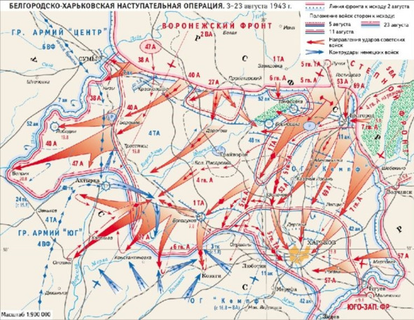 Немецкая группировка, прикрывающая белгородско-харьковский укрепрайон, состояла из 4 танковой армии и оперативной группы «Кемпф» (с 18 августа 8 полевая армия). Они включали 15 пехотных и 4 танковые дивизии, 300000 личного состава, 3000 орудий, 600 танков и штурмовых орудий. 4 воздушный флот насчитывал свыше 1000 самолетов104.