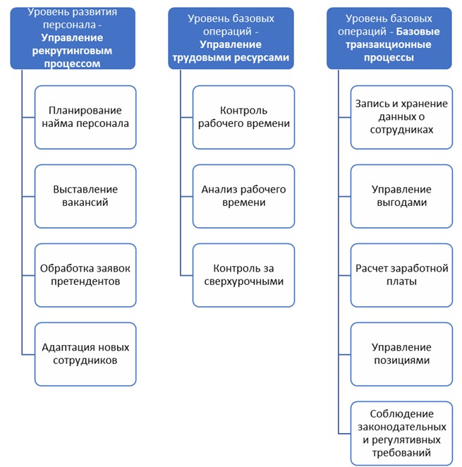 Таким образом, информационная система управления персоналом – это комплекс технологий, автоматизирующих и облегчающих работу с персоналом на всех уровнях, от оперативного (повседневный учет данных) до стратегического (принятие решений по развитию компании).