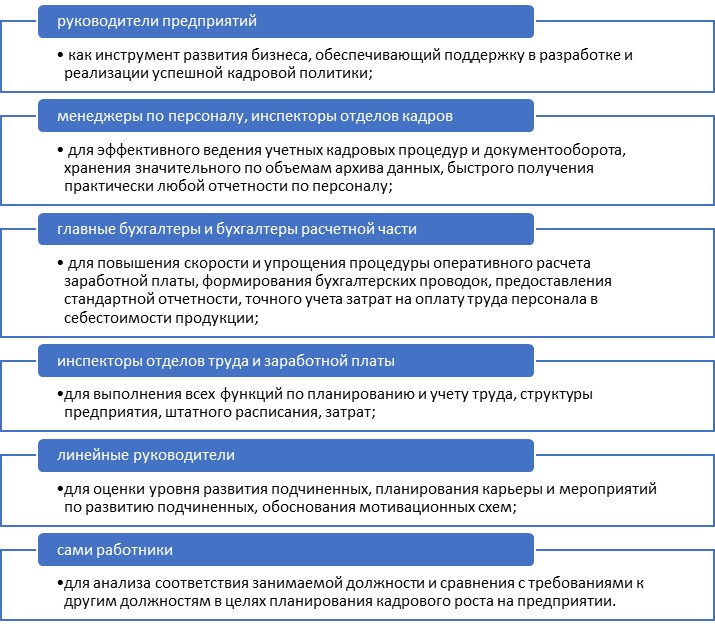 Современные HRM-системы охватывают все возможные области деятельности службы персонала. Основной отличительной чертой этих программ является наличие единого информационного пространства, которое позволяет использовать в работе каждого модуля все многообразие накопленной в системе информации, построить эффективные аналитические системы и системы поддержки принятия решений. Современные системы автоматического управления персоналом созданы для того, чтобы оптимизировать работу руководства и сотрудников кадровых служб компаний (помимо бухгалтеров и некоторых других специалистов). Они играют значительную роль в повышении эффективности их работы.