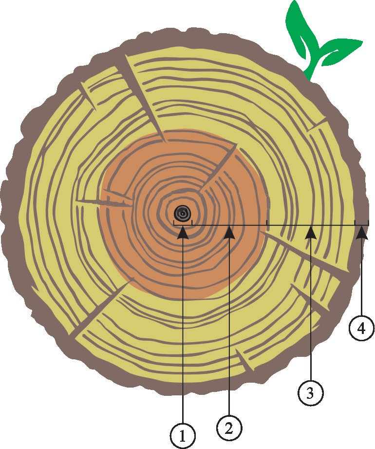 Обобщенная структура ствола дерева: 1 – сердцевина; 2 — ядро; 3 – заболонь; 4 – кора