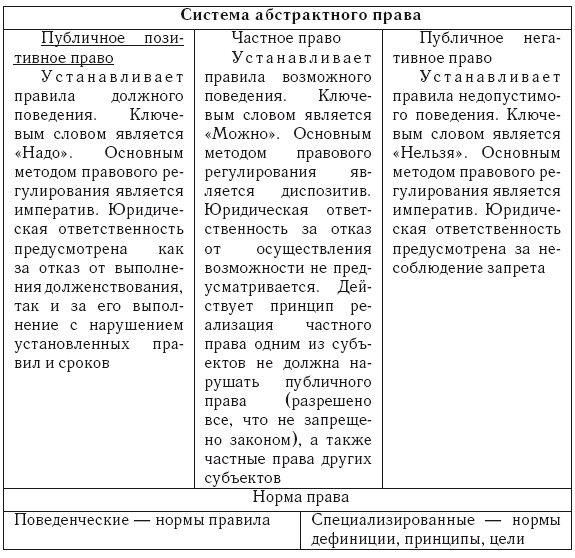 Абстрактное право включает в себя в качестве системных элементов публичное позитивное, публичное негативное и частное право. Соотношение элементов права представлено в таблице.