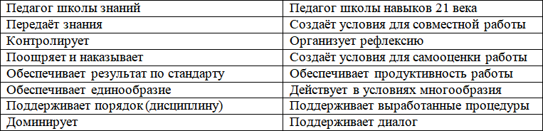 Навыки 21 века требуют от педагога высокого уровня социально-коммуникативной компетентности, то есть роли хорошо владеющего знаниями организатора, как по предмету, так и психологии развития и социальной психологии, регулирования процесса совместной детской работы. В этом случае учитель не подавляет, а инициирует и поддерживает инициативу, помогает фиксировать процедуры труда. В таблице 1 представлены задачи учителя в «парадигме школы знаний» и «школы навыков 21 века».