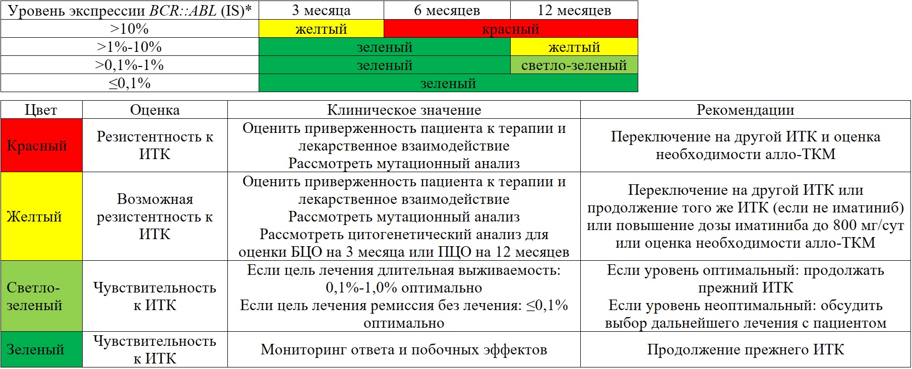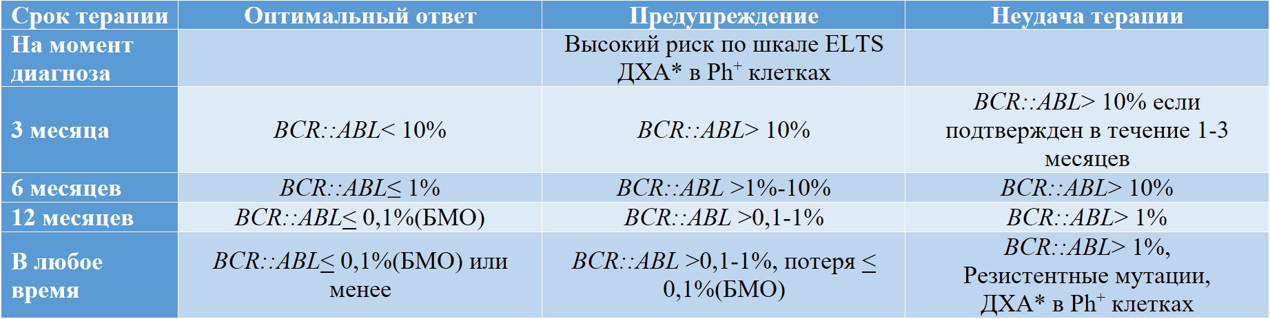 2 Для стандартизации результатов необходим пересчет каждого результата в международную шкалу (IS). С целью исключения внутрилабораторной вариабельности изменение уровня BCR::ABL менее чем на 1 log нуждается в подтверждении при повторном анализе.
