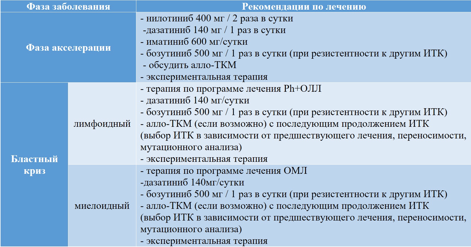 При неудаче двух линий терапии, а также при прогрессировании в продвинутые фазы на фоне терапии ИТК вопрос о выполнении алло-ТКМ необходимо решать незамедлительно, так как этот метод является единственным, способным в этой ситуации дать шанс на длительную безрецидивную выживаемость.