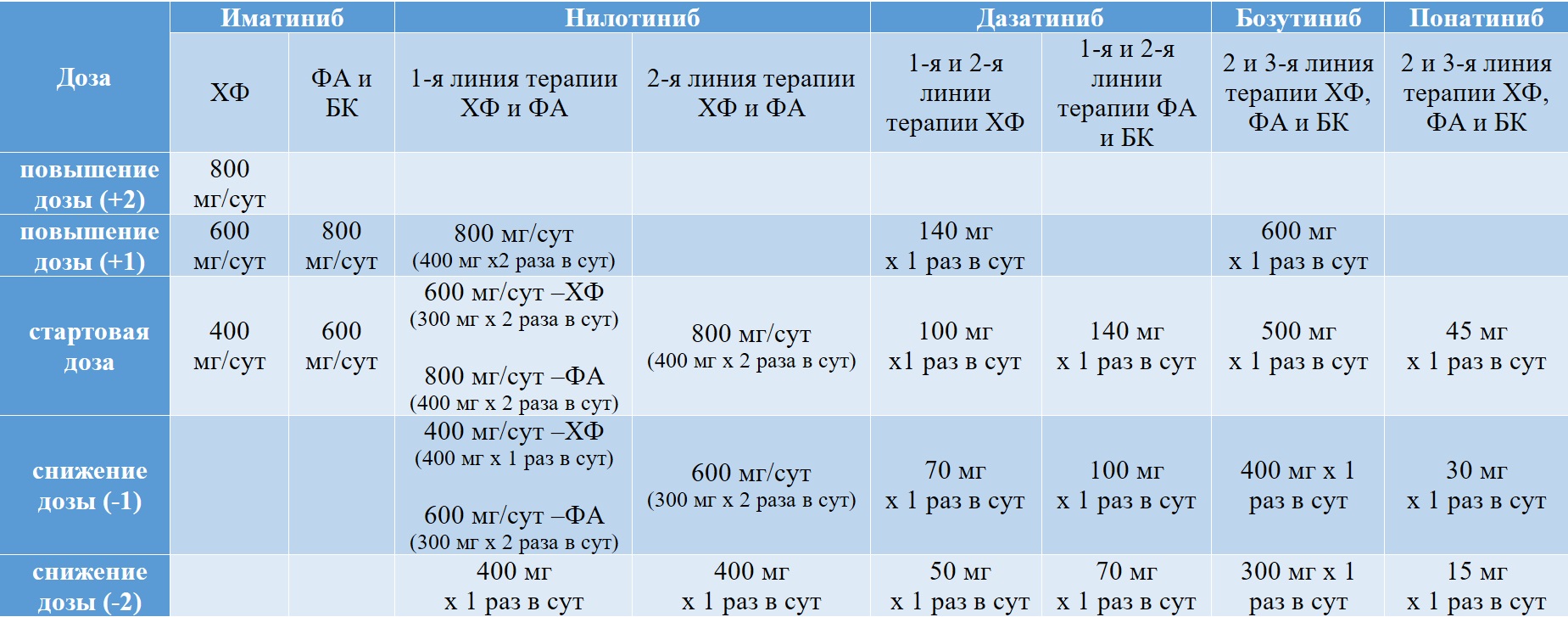 В Российской Федерации в настоящее время зарегистрированы четыре лекарственных препарата из группы ИТК для лечения ХМЛ: иматиниб, нилотиниб, дазатиниб и бозутиниб. Все эти препараты могут применять как в первой, так и в последующих линиях таргетной терапии ХМЛ. Рекомендуемые дозы ИТК приведены в таблице II-4.