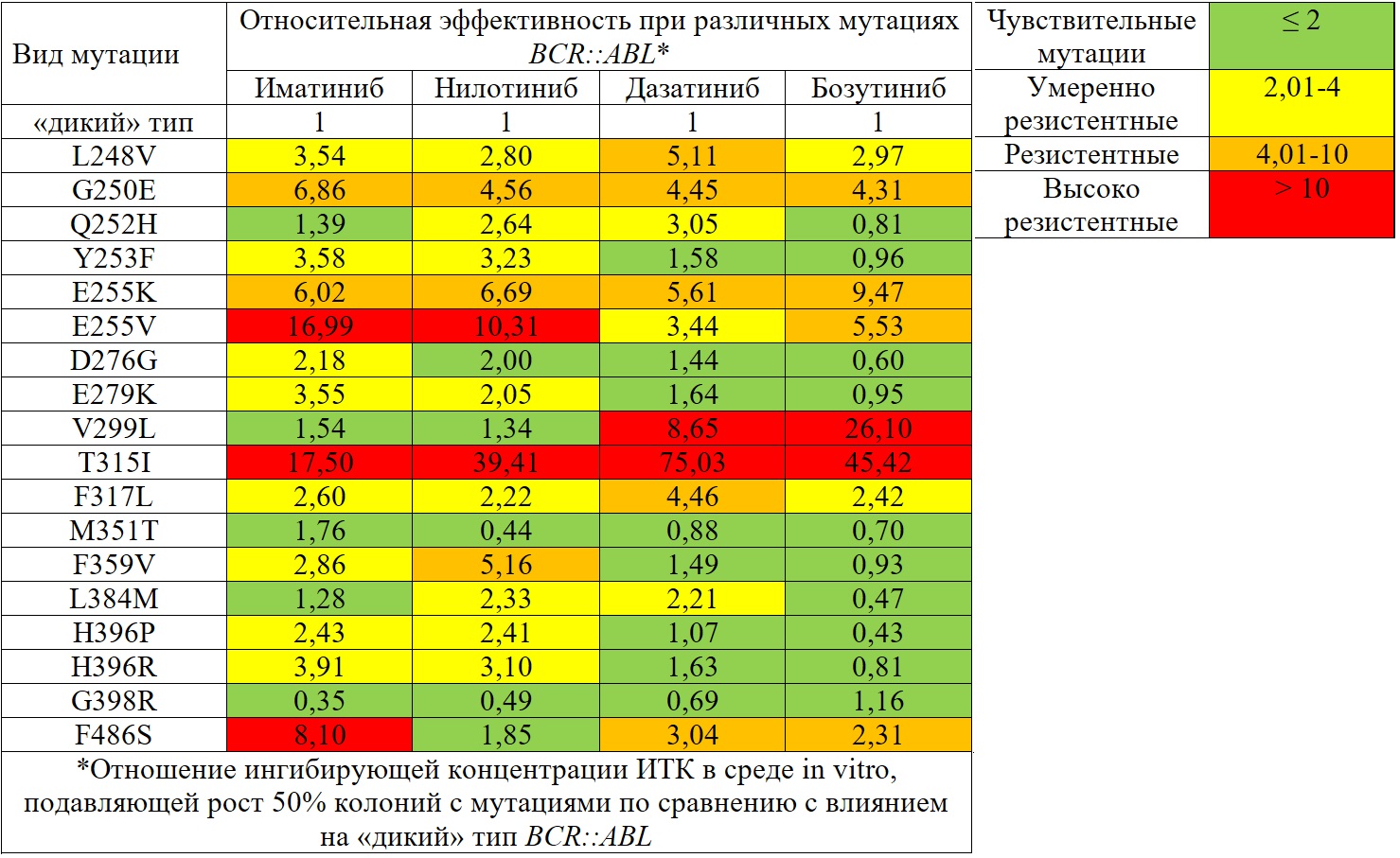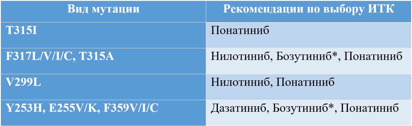 * данные относительно чувствительности к бозутинибу при мутациях BCR::ABL ограничены, по некоторым данным in vivo мутации E255K и в меньшей степени E255V могут быть плохо чувствительны к бозутинибу [16].