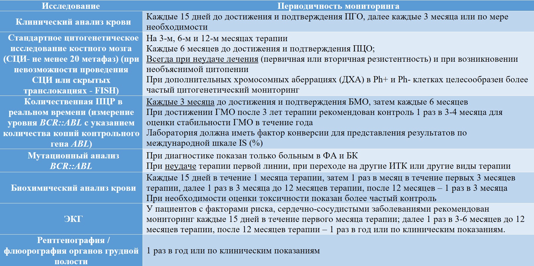 Таблица II-7. Частота динамического обследования больных ХМЛ, получающих ИТК [15, 19, 33]