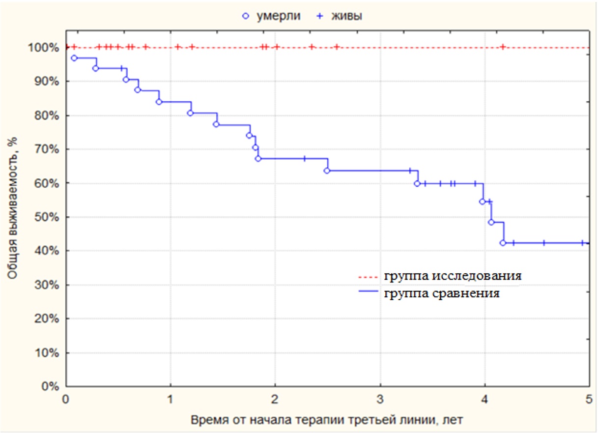 Общая выживаемость была значимо (p=0,0001) выше в группе исследования по сравнению с группой сравнения: 3-летняя ОВ составила в группе исследования 100 % и 64 % – в группе сравнения (рисунок II-5).