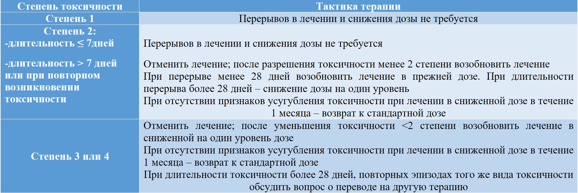 • если перерыв в лечении составлял менее 2 недель, то терапия возобновляется в прежней дозе, при перерыве более 2 недель – в сниженной на один уровень дозе (см. табл. 4 – дозы ИТК);