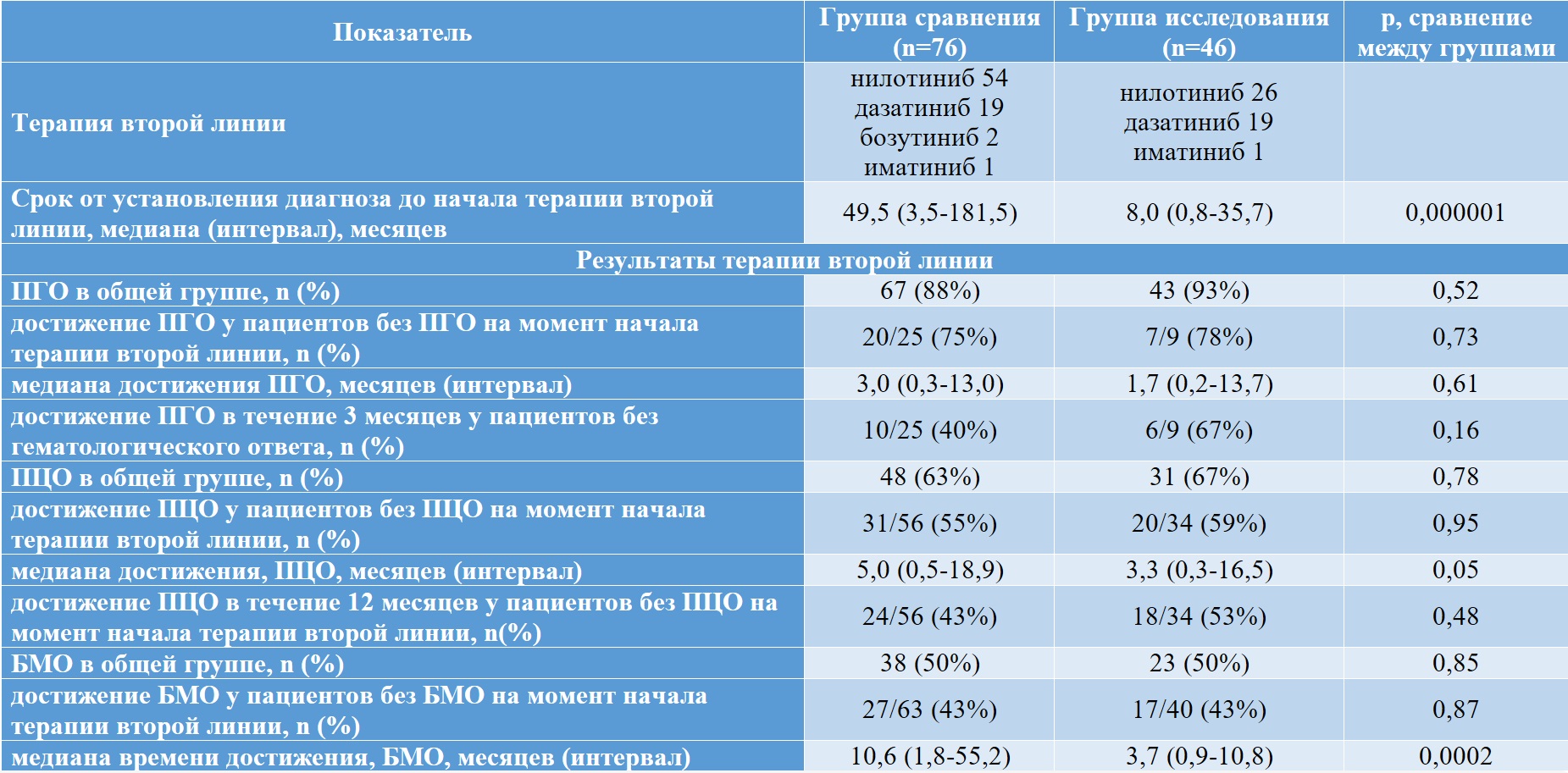 Вторая линия терапии проводилась в группе сравнения 76 больным (нилотиниб – 54, дазатиниб – 19, бозутиниб – 2, иматиниб – 1); в группе исследования 46 пациентам (нилотиниб – 26, дазатиниб – 19, иматиниб – 1).