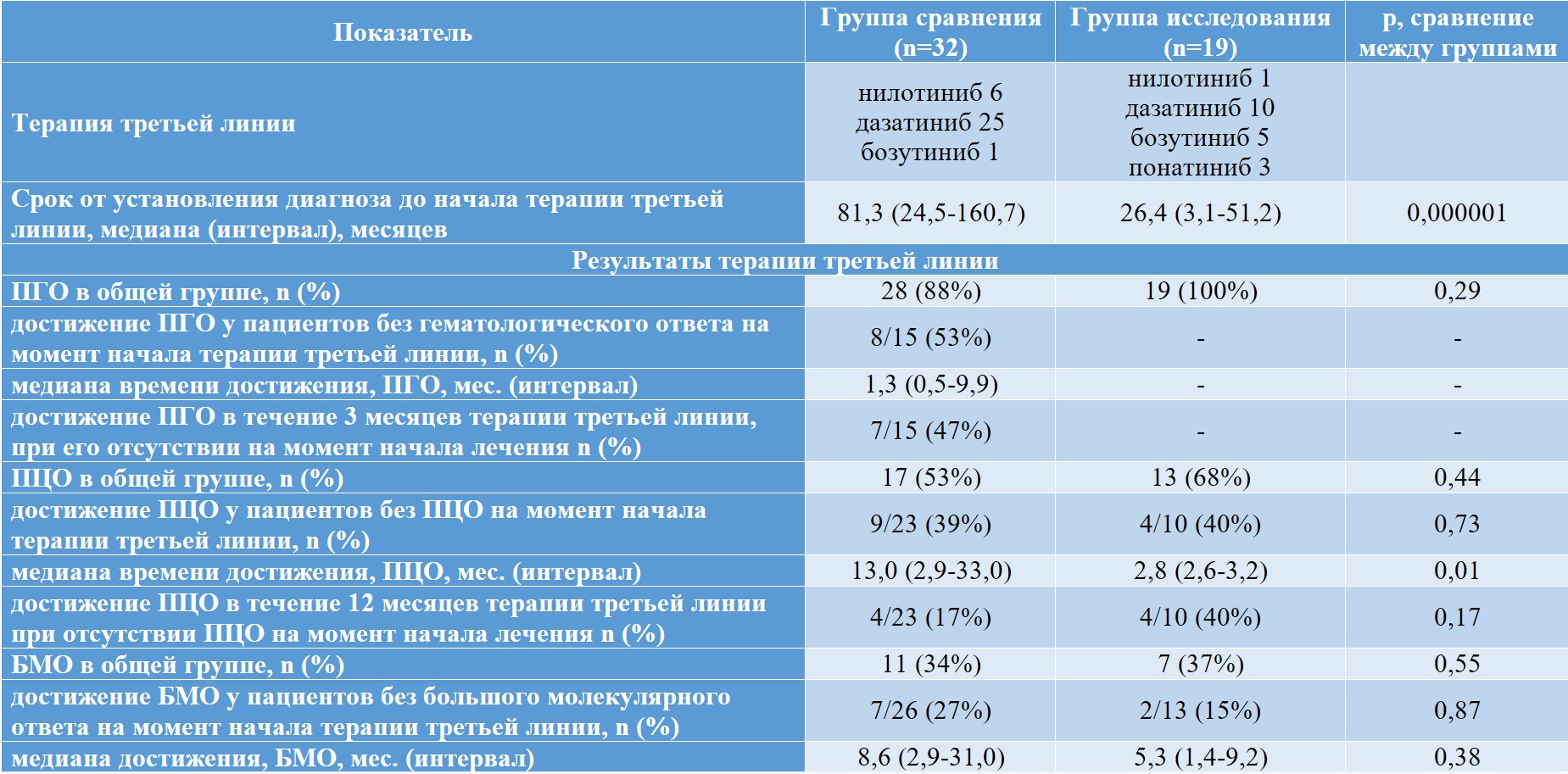 Общая частота ПЦО, частота его достижения при отсутствии ПЦО на момент начала терапии третьей линии, а также частота достижения ПЦО в течение первых 12 месяцев лечения были выше в группе исследования по сравнению с группой сравнения, но без статистической значимости. Медиана длительности достижения ПЦО была значимо короче в группе исследования чем группе сравнения. Большой молекулярный ответ достигался одинаково часто в группах исследования и сравнения, как в общем, так и при анализе подгрупп пациентов, не имевших БМО на момент начала терапии третьей линии. Медиана длительности достижения БМО была короче в группе исследования (3,7 месяцев) по сравнению с группой сравнения (10,6 месяцев), однако, без статистической значимости различий.