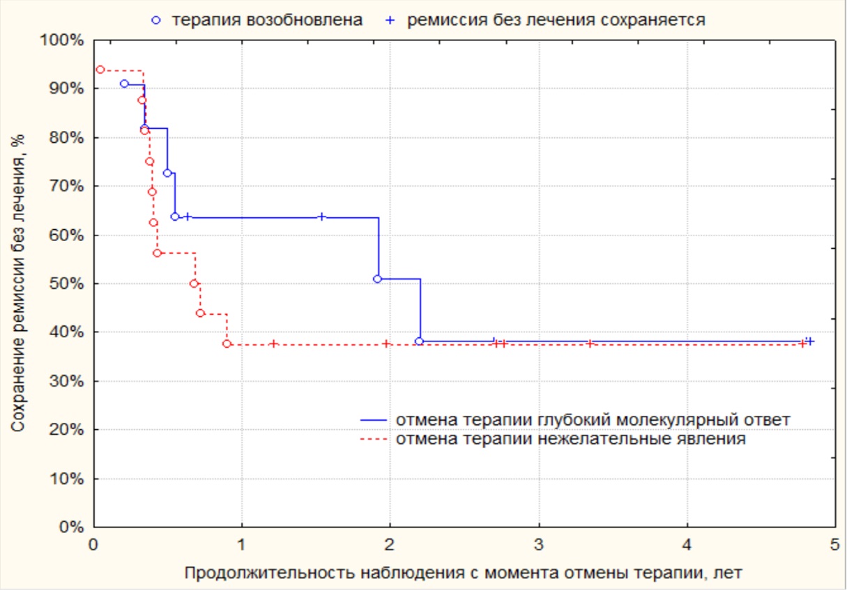 Продолжительность сохранения ремиссии без использования ингибиторов тирозинкиназ статистически значимо не зависела от причины отмены терапии (p=0,59) (рисунок II-6).