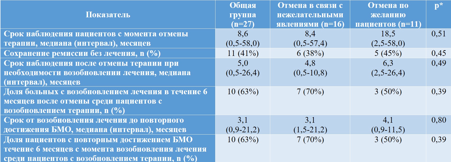 Таблица II-19. Результаты использования методики ведения ремиссии ХМЛ без использования ингибиторов тирозинкиназ