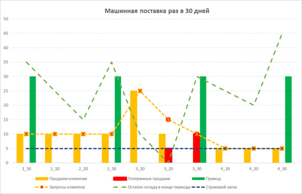 Причина, почему всё равно следует выбирать варианты логистики с меньшей периодичностью, то есть более частые и мелкие поставки – не в сокращении потерянных продаж. Поставки крупными партиями часто приводят к необоснованным излишкам. Поэтому, для достижения лучшей эффективности (путём улучшения оборачиваемости) и для уменьшения затрат на складское хранение, при том же цикле поставки и себестоимости товара, всегда рекомендуется подвозить товар чаще мелкими партиями. А чтобы снизить возможные потерянные продажи (15, которые мы видели на графике), используют при заказе мелкими партиями достаточный страховой запас, чтобы удовлетворять в том числе увеличенные запросы клиентов. Если бы страховой запас был бы не 5, а 20, то и потерянных продаж при поставке машиной не было бы, и средний склад и оборачиваемость при этом были бы всё равно меньше, чем при вагонной поставке.