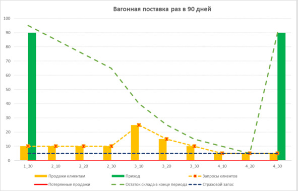 Как видим из графиков, у варианта с вагонными поставками с периодичностью раз в три месяца больше фактических продаж и нет потерянных продаж. Такой эффект произошёл за счёт переноса запросов клиентов (25 и 15 в примере) на первую и вторую декаду третьего месяца с четвертого месяца. Эти заявки не были отгружены при варианте поставок машинами, клиенты не смогли взять со склада столько, сколько хотели. В момент запроса на складе не было достаточно товара. Это привело к потерянным продажам (15 в примере). Именно крупные вагонные поставки в сравнении с более мелкими поставками машинами предоставляют клиентам возможности взять со склада больше товара в любой момент периода и снижают потерянные продажи при том же суммарном спросе. Более крупная партия закупки по сравнению с мелкой партией (увеличение периодичности) по фиксированному графику никогда не будет являться причиной потерянных продаж.