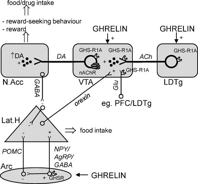 Действие дофаминергических нейронов в VTA обеспечивается через различные афференты и, в пределах VTA, GHS-R1A представлены не только дофаминергическими клетками, но также пресинаптическими афферентами (Abizaid et al., 2006) которые могут обеспечивать способность грелина активировать систему награды. Особенно заметна возможность грелина повышать локомоторную активность, выброс прилежащего дофамина в условиях предпочтения места (совмесное воздействие подкрепления с грелин-парной средой), которая ослаблялась неселективными антагонистами глутамат NMDA рецепторов (AP5) (Jerlhag et al., 2011). Супрессия GHS-R1A уменьшает подкрепляющие свойства алкоголя и соответственно снижает потребление алкоголя у мышей (Jerlhag et al., 2009), а воздействие антагонистов GHS-R1A снижает подкрепляющие возможности амфетамина и кокаина (Jerlhag et al., 2010). Клинические данные также говорят о роли GHS-R1A в регуляции потребления наркотиков (Landgren et al., 2008, 2010). Интересен тот факт, что ограничение пищи, которое повышает уровень грелина (Gualillo et al., 2002), увеличивает кокаино- и амфетаминоиндуцированную локомоторную стимуляцию, увеличивает поиск кокаина и самостимуляцию от какоина или амфетамина у крыс (Carroll et al., 1979).