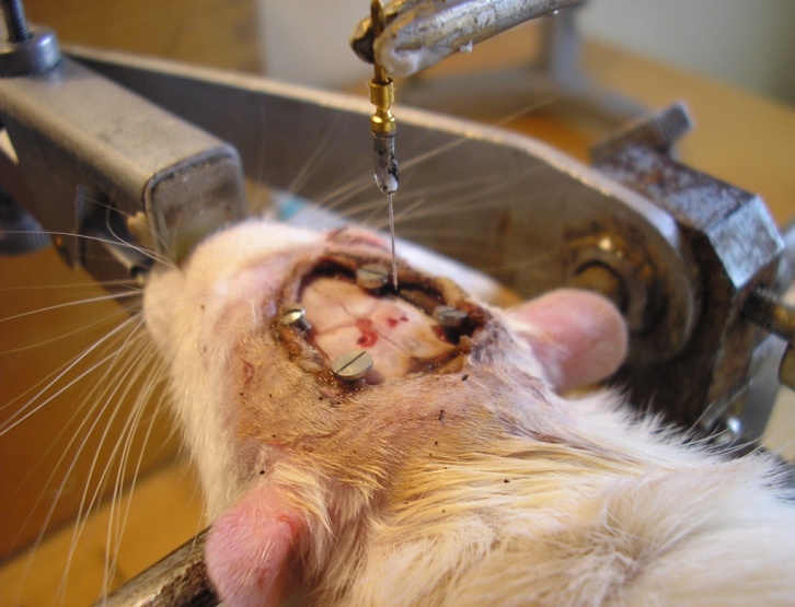 Металлические направляющие канюли из нержавеющей стали диаметром 0,2 мм вживляли униполярно в правый желудочек мозга одновременно с электродами, вводимыми в латеральный гипоталамус, по следующим координатам (рис.2): АР = 0,8 мм назад от брегмы, SD = 1,4 мм латерально от сагитального шва, Н = 3,8 мм от поверхности черепа согласно атласу K. P. König и A. A. Klippel (1963).