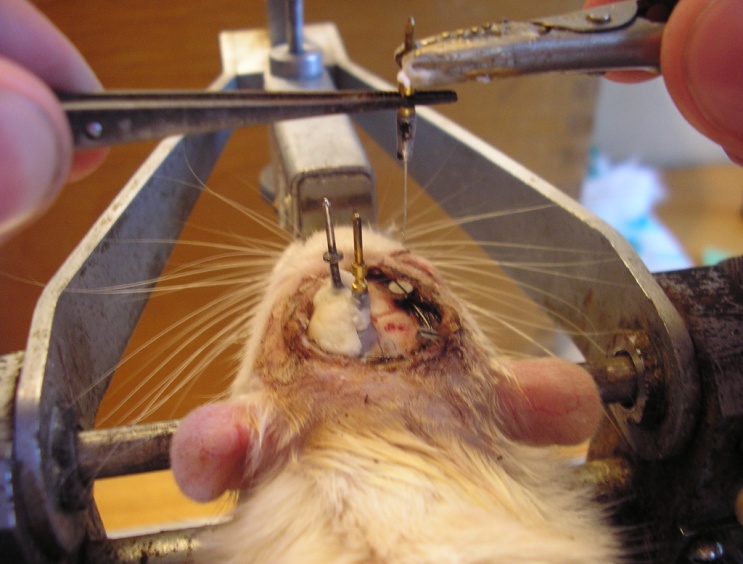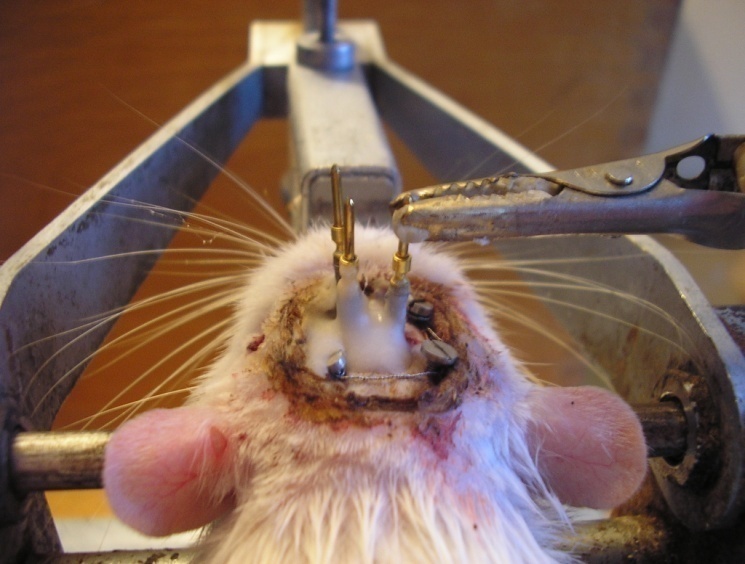 Вживление электродов и канюль в мозг крысам проводили под нембуталовым наркозом (50 мг/кг) с использованием стереотаксического прибора фирмы «Medicor», Венгрия. Билатерально в латеральное гипоталамическое ядро вживляли нихромовые монополярные электроды в стеклянной изоляции (диаметр электрода 0,25 мм, длина оголенного кончика 0,25-0,30 мм, его толщина 0,12 мм) по следующим координатам: АР = 2,5 мм назад от брегмы, SD = 2,0 мм латерально от сагиттального шва, Н = 8,4 мм от поверхности черепа (KönigK. P., KlippelA. A., 1963; Дробленков А. В., 2006). Индифферентный электрод из нихромовой проволоки закрепляли на черепе животного. Все электроды коммутировались на микроразъеме, который фиксировался на черепе самотвердеющей пластмассой (рис.1).