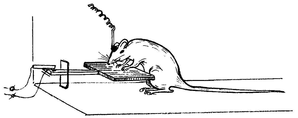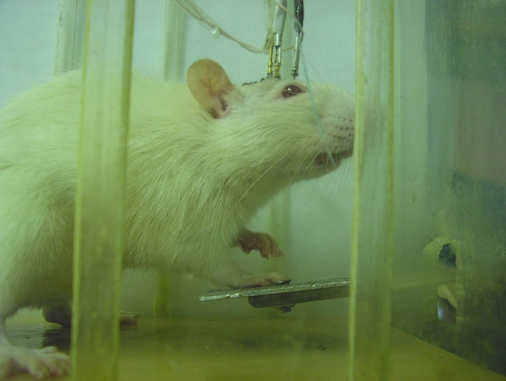 Для воспроизведения самораздражения мозга у крыс использовали классический вариант изучения самостимуляции мозга в виде педальной самостимуляции в камере Скиннера. Через 10 дней после вживления электродов в мозг крыс обучали нажимать на педаль в камере Скиннера для получения электрического раздражения мозга (прямоугольные импульсы отрицательной полярности, длительностью 1 мс, с частотой 100 Гц, в течение 0,4 с, пороговыми значениями тока в режиме «фиксированных пачек»– FR1). Для повторного раздражения животное было вынуждено вновь нажимать на педаль. Анализировали частоту и пороги реакции самостимуляции. Фармакологические препараты вводили на 3-й день эксперимента после стабилизации реакции при использовании фиксированного значения силы тока. Частота нажатий регистрировалась автоматически (рис.5).