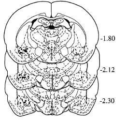 Координаты по атласу К. Кёнига и А. Клиппеля (1963). Показаны фронтальные срезы в мм относительно брегмы.
